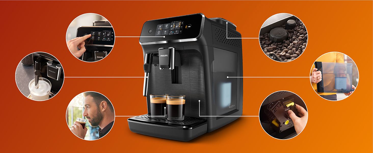 Learn about Philips 2200 SeriesEasily make delicious, aromatic coffee with fresh coffee beansWith the intuitive touch display, it's easy to enjoy aromatic coffee varieties from fresh beans at the touch of a button. The classic milk frother also lets you make silky smooth cappuccino or latte macchiato with ease. Through the My Coffee Selection menu, you can also further customize each drink to your personal taste, adjusting the strength, strength and aroma of the coffee.