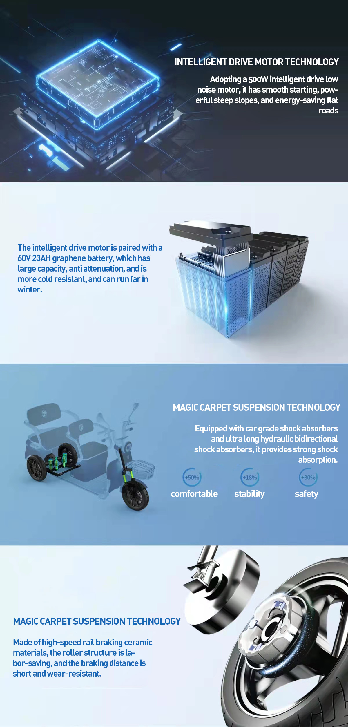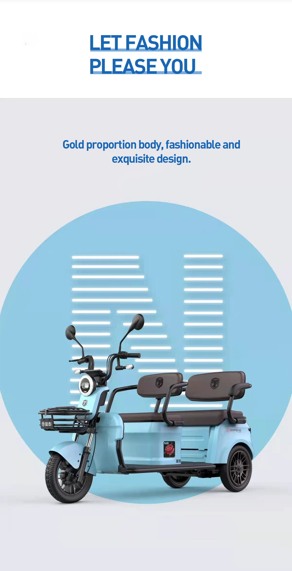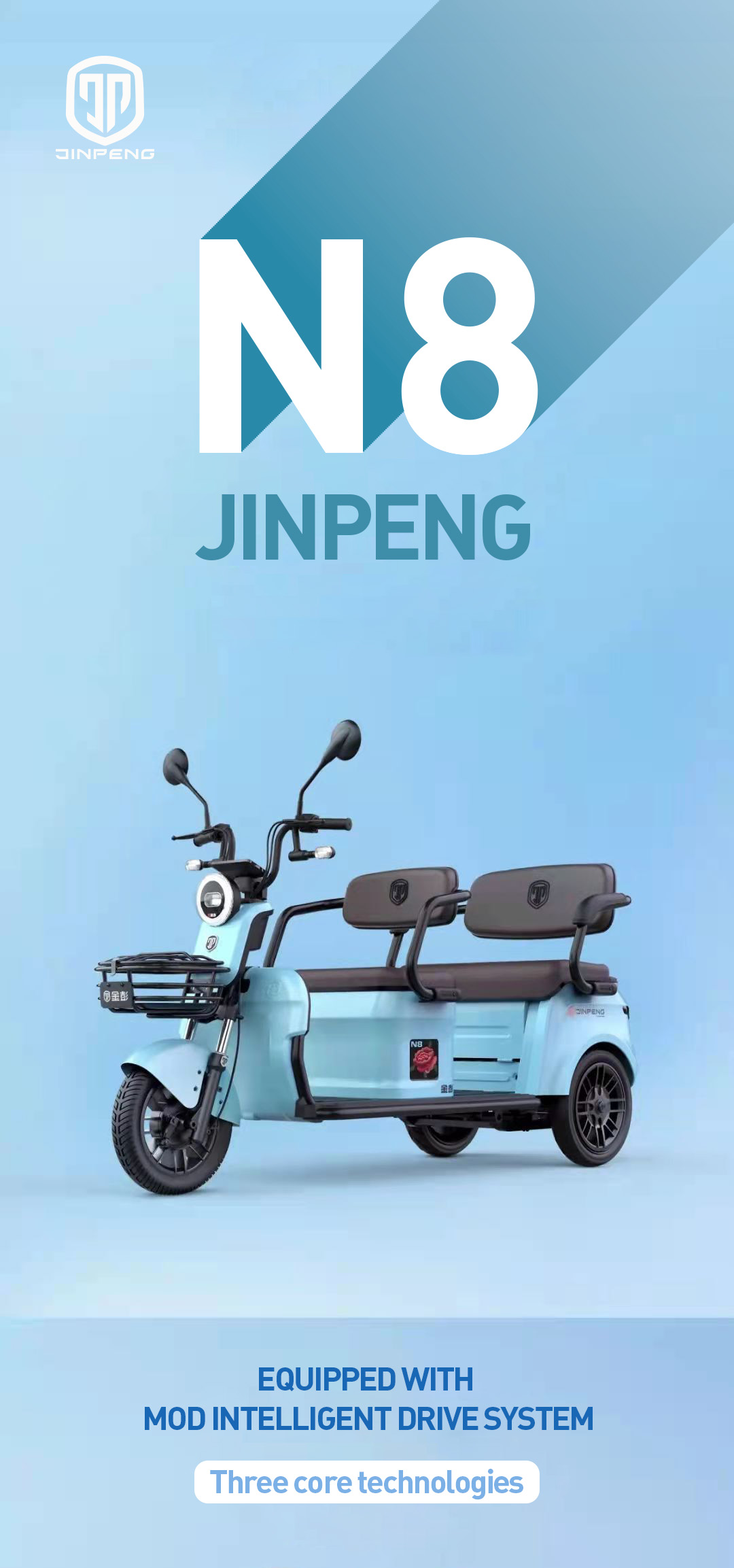 The Jinpeng N8 electric leisure tricycle is designed to provide an exceptional riding experience. combining advanced technology with comfort and safety. Whether for daily commuting. shopping. or family outings. the N8 meets all your needs.