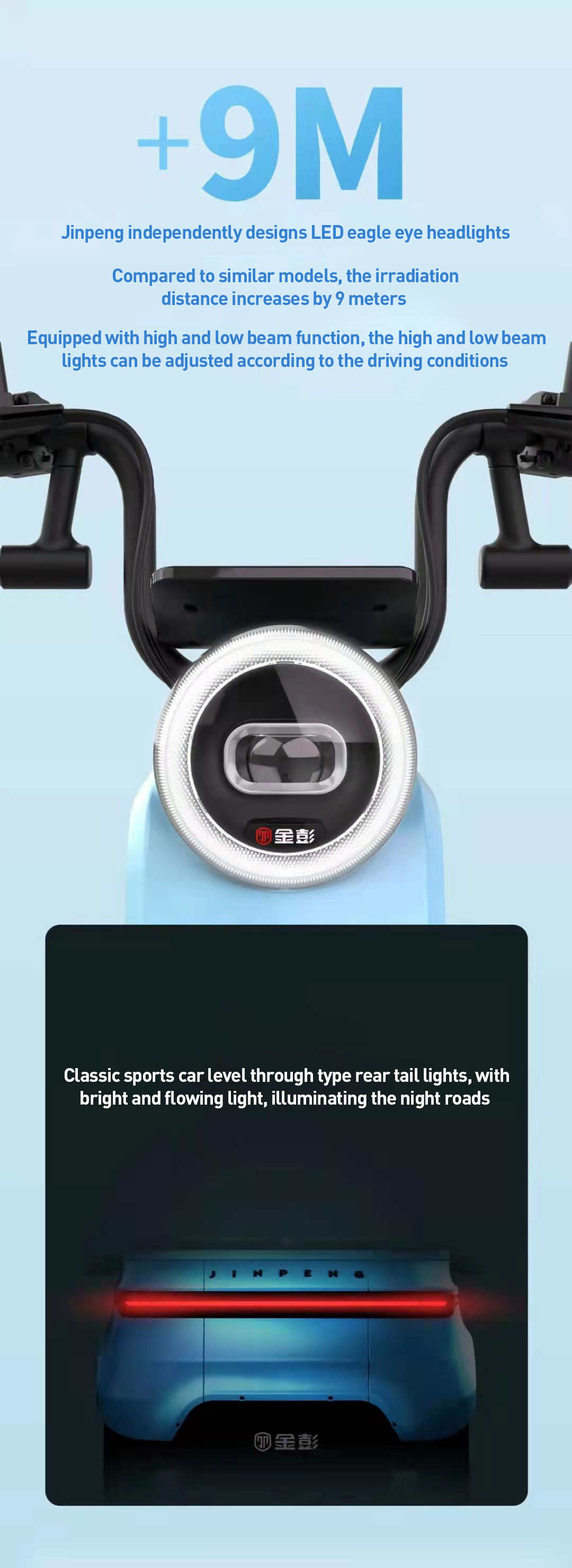• LED Eagle Eye Headlights : The N8 features Jinpeng's proprietary LED eagle eye headlights. which increase the illumination distance by 9 meters compared to similar models. This ensures better visibility and safer night riding.