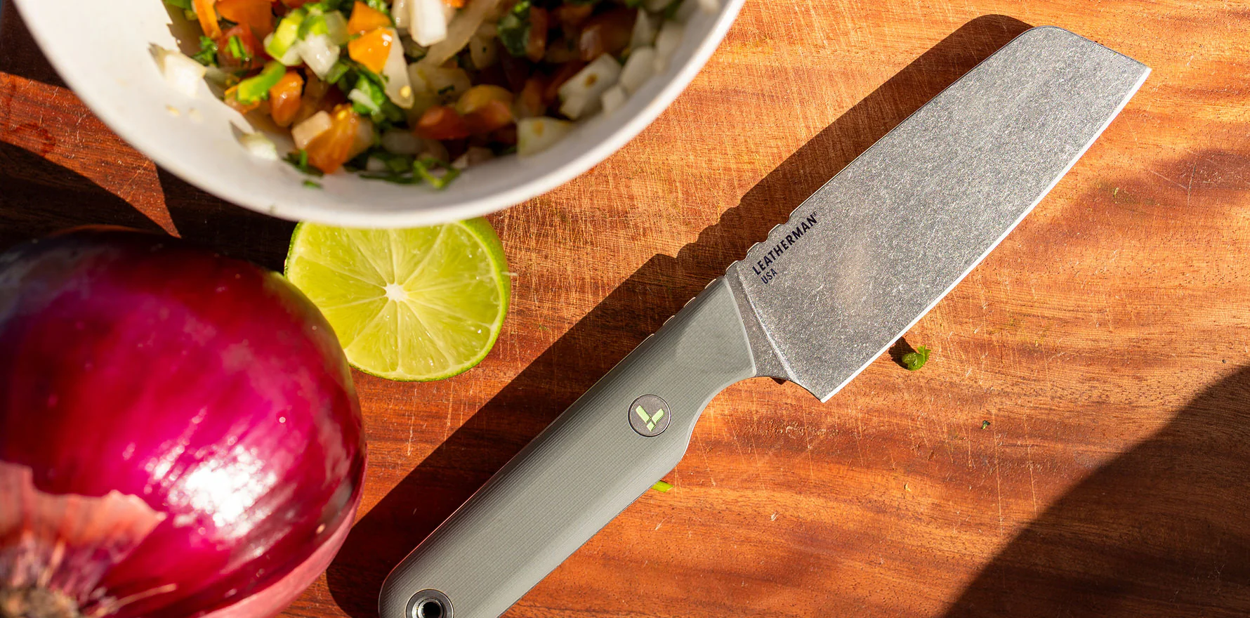 The Rustle™ is an essential fixed blade knife crafted for meal-prep perfection and culinary versatility in the great outdoors. Inspired by chuckwagon cooks from the past but designed with the modern camper in mind, this outdoor kitchen chef knife is great for everything from dicing vegetables to slicing hearty cuts of meat. Its versatile Santoku blade and ergonomic handle streamline mealtime prep without adding bulk to your kit. The premium materials are made for the elements. High-performance MagnaCut® stainless steel is tough, holds its edge longer, and resists corrosion. The machined and oiled G10 handles are durable, textured for grip, and weather resistant. Available in three colors: Alpine, Vapor Grey, and Evergreen. The rugged Kydex sheath protects your blade in outdoor environments. Made in the USA.