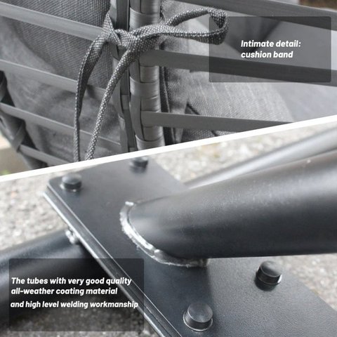 Qualified Material- Use better strength cold-rolled tube. the thickness of the main tubes are above 3.0mm to 10mm; UV protected polyethylene resin rattan wrapped. featuring strength and durability. weather resistant. corrosion resistant. odourless and easy to cleanup;10“ thickness soft cushion with high density foam. soft and comfortable; 230g/m2 high quality olefin fabric;