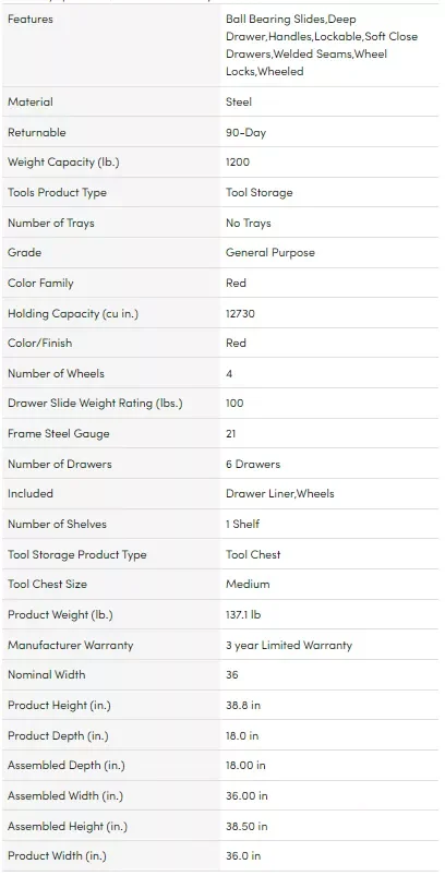 This Husky 36 in. 6-Drawer Rolling Tool Cabinet in Red is great for storing and organizing all your tools. The cabinet is made from high grade all welded steel construction and finished with a tough industrial red powder coat paint. 6-Drawers provide a total of 12,730 cu. in. storage capacity. Drawers are all full-extension and glide effortlessly on soft-closing ball-bearing slides that can support up to 100 lbs. The ergonomic handle and stylish 5 in. x 2 in. casters allow you to easily move your cabinet around your workspace. Total weight capacity of the cabinet is 1,200 lbs. The cabinet also has an internal keyed locking system, with 2 keys provided, for added security.